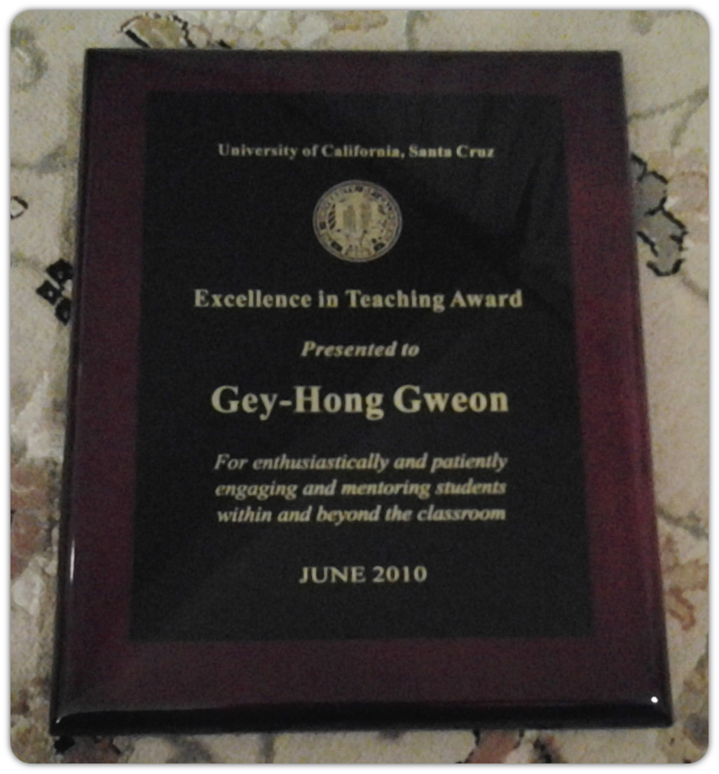 In 2010, I received an excellence in teaching award. Here is a photo of the plaque.