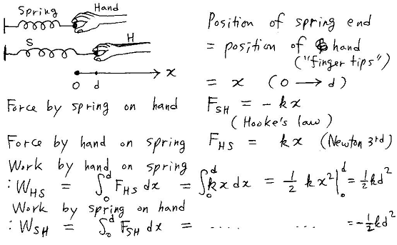 Example 1: A spring is attached to a wall. The spring constant k = 100 N /m. You grab the other end, and you stretch the spring very very slowly (“adiabatically”). You stretch it by 1 cm = 0.01 m. How much work did you do to the spring? How much work did the spring do to you?