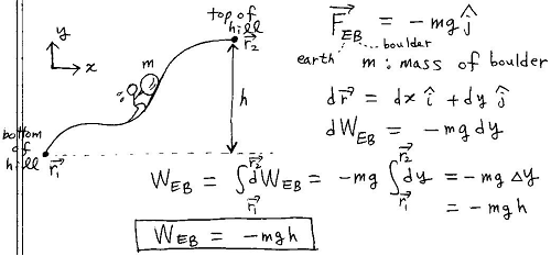 Example 2: Sisyphus is rolling a boulder from the bottom of the hill to the top of the hill, as shown. What is the work that the Earth(’s gravity) did on the boulder?